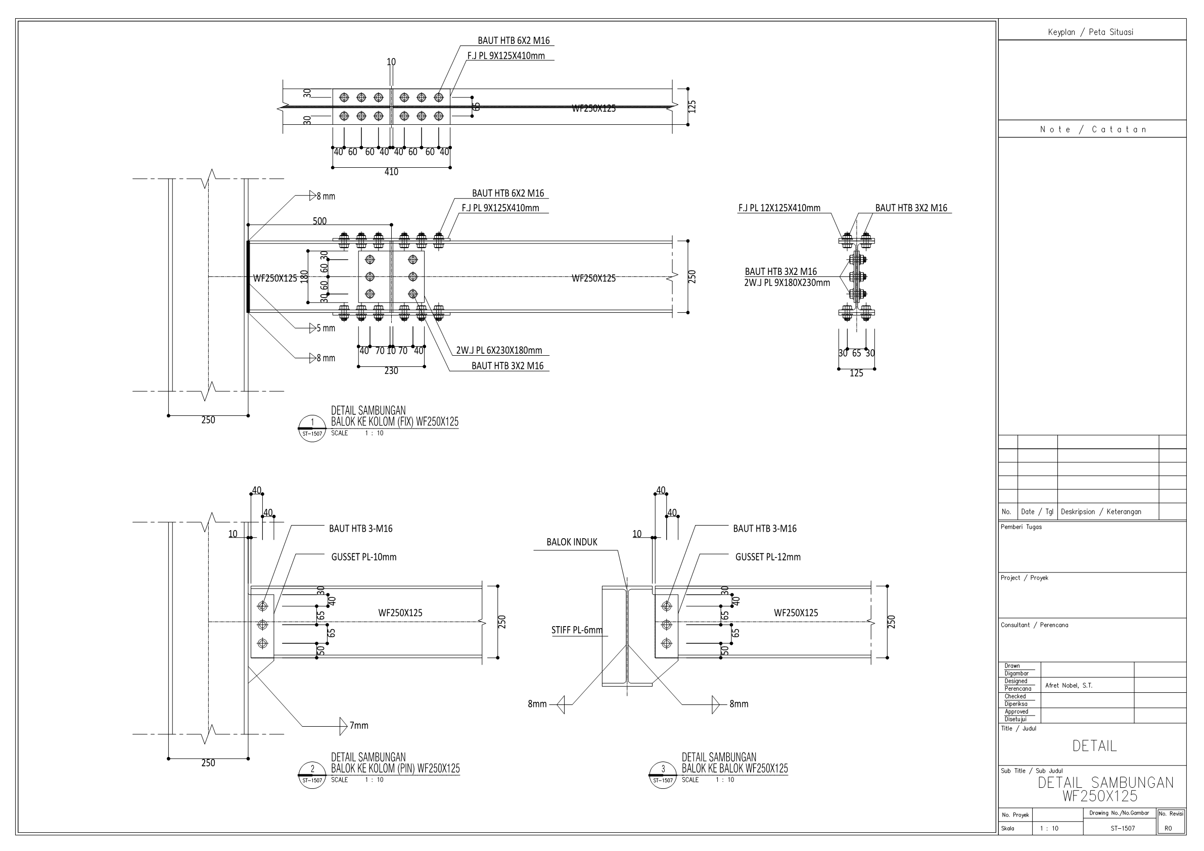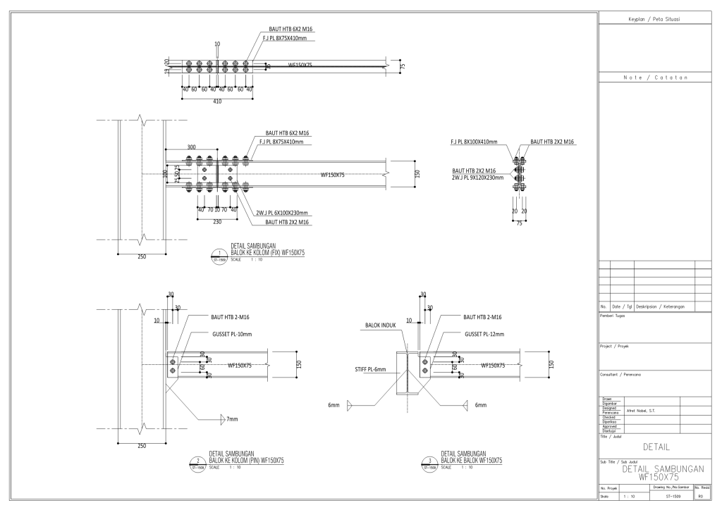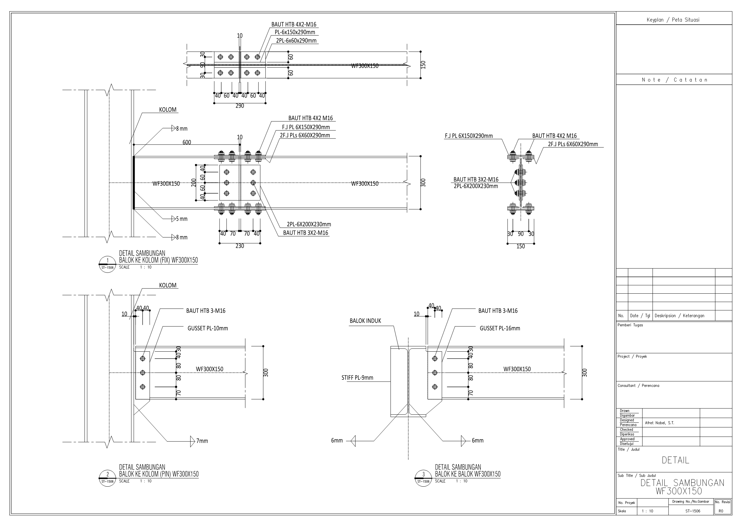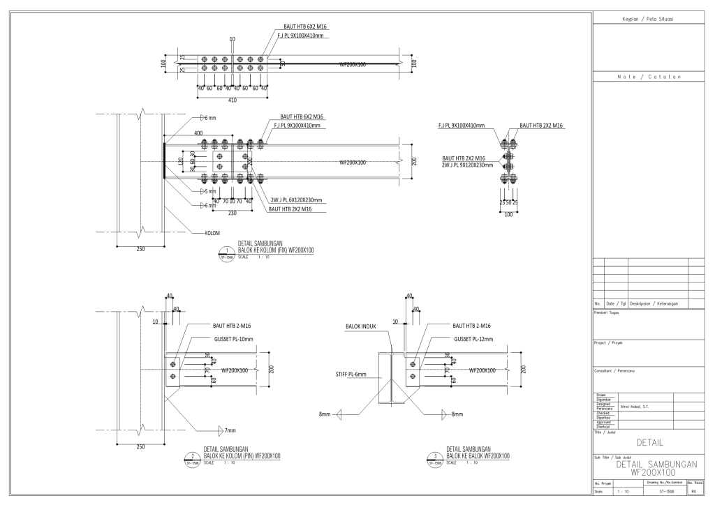 Baut menggunakan diameter 16 mm. Dan sambungan las sesuai dengan ketebalan pelat pada bagian yang disambung.
