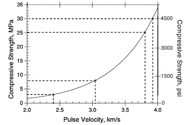 Tata cara pengambilan data cepat rambat dengan UPV Test diatur dalam ASTM C597 Standard Test Method for Pulse Velocity Through Concrete, sedangkan interpretasi hasil pengukuran cepat rambat terhadap mutu beton diatur berdasarkan ACI 228.1R-03 In-Place Methods to Estimate Concrete Strength, khususnya pasal 2.6 mengenai Ultrasonic Pulse Velocity. Dalam pasal ini dikatakan bahwa hubungan antara kuat tekan dan cepat rambat adalah nonlinear dan hubungan yang sesungguhnya antara kedua hal ini sangat tergantung campuran beton itu sendiri. Berarti hubungan antara kuat tekan beton dan cepat rambat dari masing-masing campuran beton kemungkinan tidak sama. Gambar 2.3 merupakan contoh yang diberikan oleh ACI 228.1R-03 untuk korelasi antara kuat tekan beton dengan cepat rambat.